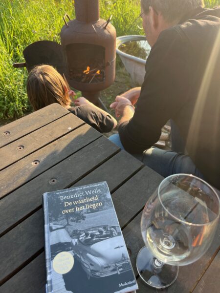 ’s Morgens een vers eitje van de kippen, een plons in de natuurvijver, en natuurlijk een stuk vlaai na een fietstocht. En dan ’s avonds een vuurtje met een verhalenbundel. Een mens wenst niet meer.
