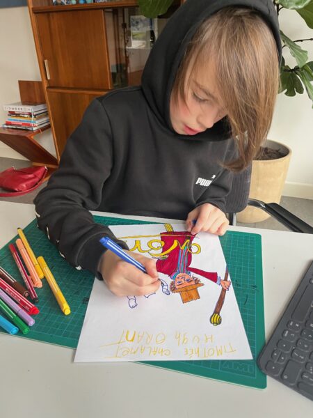 Sinds een bioscoopbezoek van Siem met zijn vader een paar weken terug, klinkt vaak de soundtrack van Wonka door ons huis. Heerlijke muziek waar ik direct dans- en theaterzin van krijg. Siem zelf raakt natuurlijk geïnspireerd om in de verkleedkist te duiken naar de juiste Wonka-outfit en hem tientallen keren te tekenen.