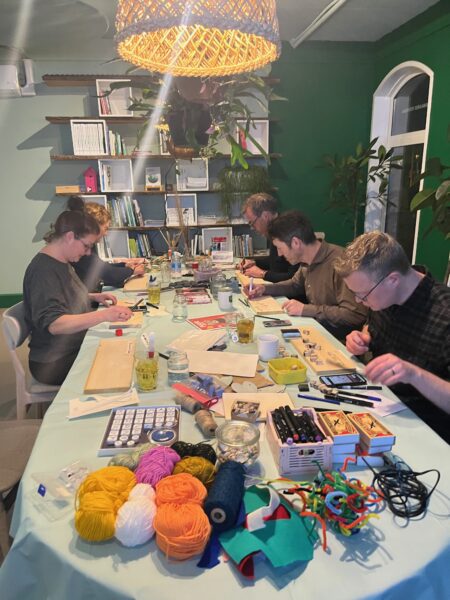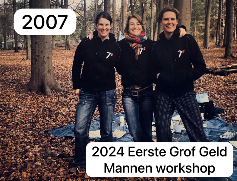 Zeventien jaar geleden werd Grof Geld geboren; in een bos bij Lage Vuursche. Onze mannen waren samen op stap, en wij schilderden op een kleed tussen de bomen opdrachtjes voor elkaar. De mannen hengelden regelmatig of zij ook niet in aanmerking kwamen voor een creatieve workshop. Gisteravond was het zover: Annette organiseerde ter ere van haar verjaardag de eerste Grof Geld Workshop voor mannen.